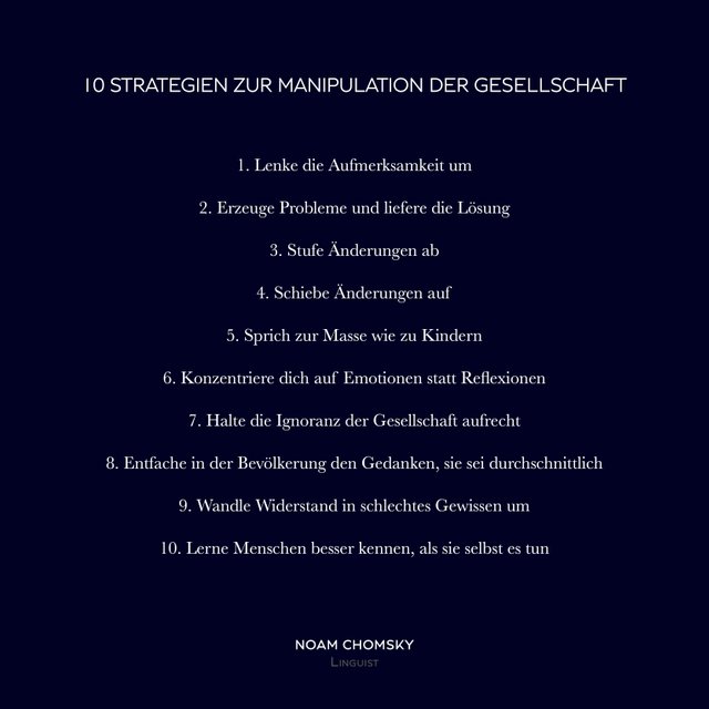 01. Lenke die Aufmerksamkeit um Lenke die Aufmerksamkeit der Öffentlichkeit auf unwesentliche Ereignisse. So wird sie von wichtigen Informationen über tatsächliche Änderungen durch politische und wirtschafliche Führungsorgane abgelenkt. Die öffentliche Meinung kehrt den wirklichen gesellschaftlichen Problemen den Rücken zu, berieselt und abgelenkt durch Unwichtiges. Schaffe es, dass die Gesellschaft beschäftigt ist. Beschäftige sie und beschäftige sie so, damit sie keine Zeit hat, über etwas nachzudenken.